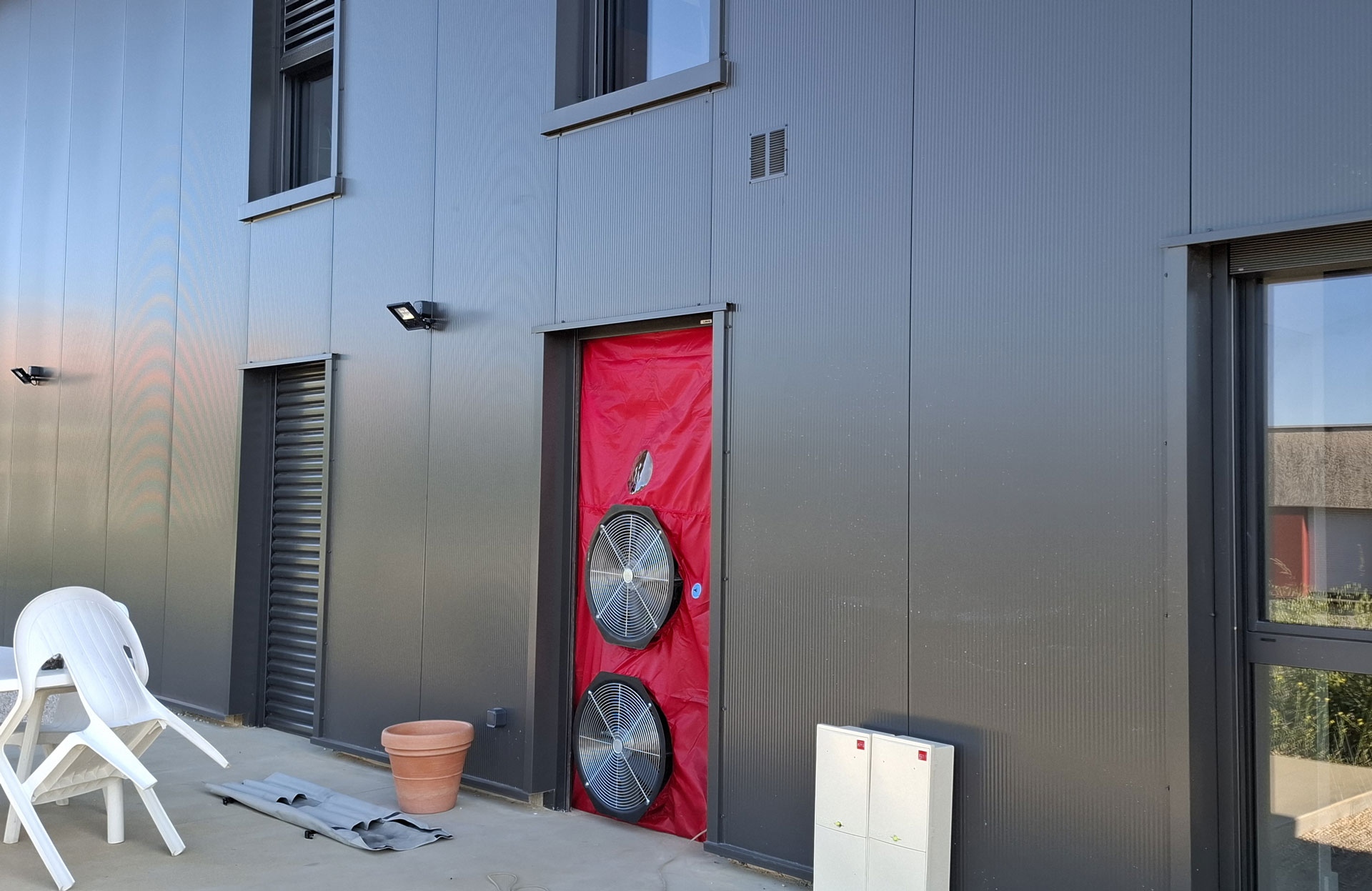 Le test d’infiltrométrie mesure les fuites d’air de l’enveloppe du bâtiment en mettant le logement en dépression à l’aide d’un ventilateur installé dans une porte. L’objectif est de vérifier la performance de l’étanchéité à l’air.